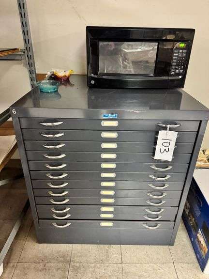 LOT 103 - Foster Blueprint File Cabinet - 12 Drawers & Contents + Microwave