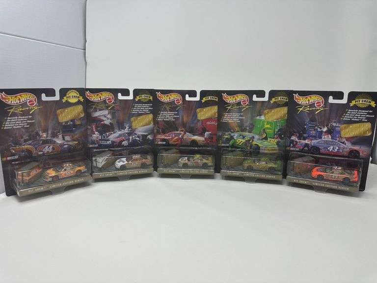 LOT 128 - (5) 1998 Hot Wheels Racing Pit Crew 1:64 Collector Edition with Pit Box (gold paint, retail blister pack) STP 22599, John Deere 22606, Mobil 1 22596, Kellogg’s 22591, Hot Wheels 22588