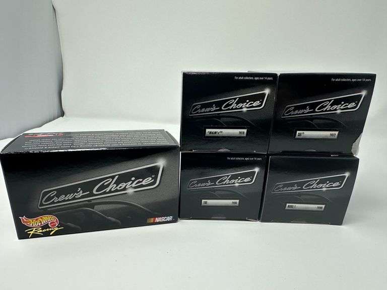 LOT 98 - (5) 2000 Hot Wheels Crew’s Choice 1:43 (black box) includes: Aerosmith 27107, M&M’s 24170, CAT 24172, Tide 24163, Mobil 1 24160