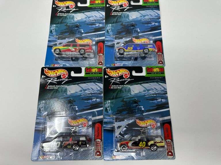LOT 161 - (4) 2000 Hot Wheels Deluxe Suburban Series Complete Set of 4 (retail blister pack with trading card) #5 Kellogg’s 27503, #60 PowerTeam 27504, #40 Team SABCO 27505, #55 Square D 27317