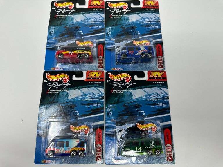 LOT 160 - (4) 2000 Hot Wheels Deluxe RV Series Complete Set of 4 (retail blister pack with trading card) #97 McDonald’s 27719, #77 Jasper Engines 27720, #44 Hot Wheels 27721, #14 Conseco 27722