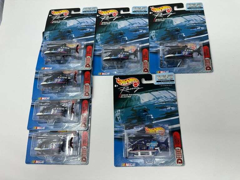 LOT 158 - (7) 2000 Hot Wheels Deluxe Helicopter Series (retail blister pack with trading card) #33 Oakwood Homes 27723, (6) #99 Exide 27725